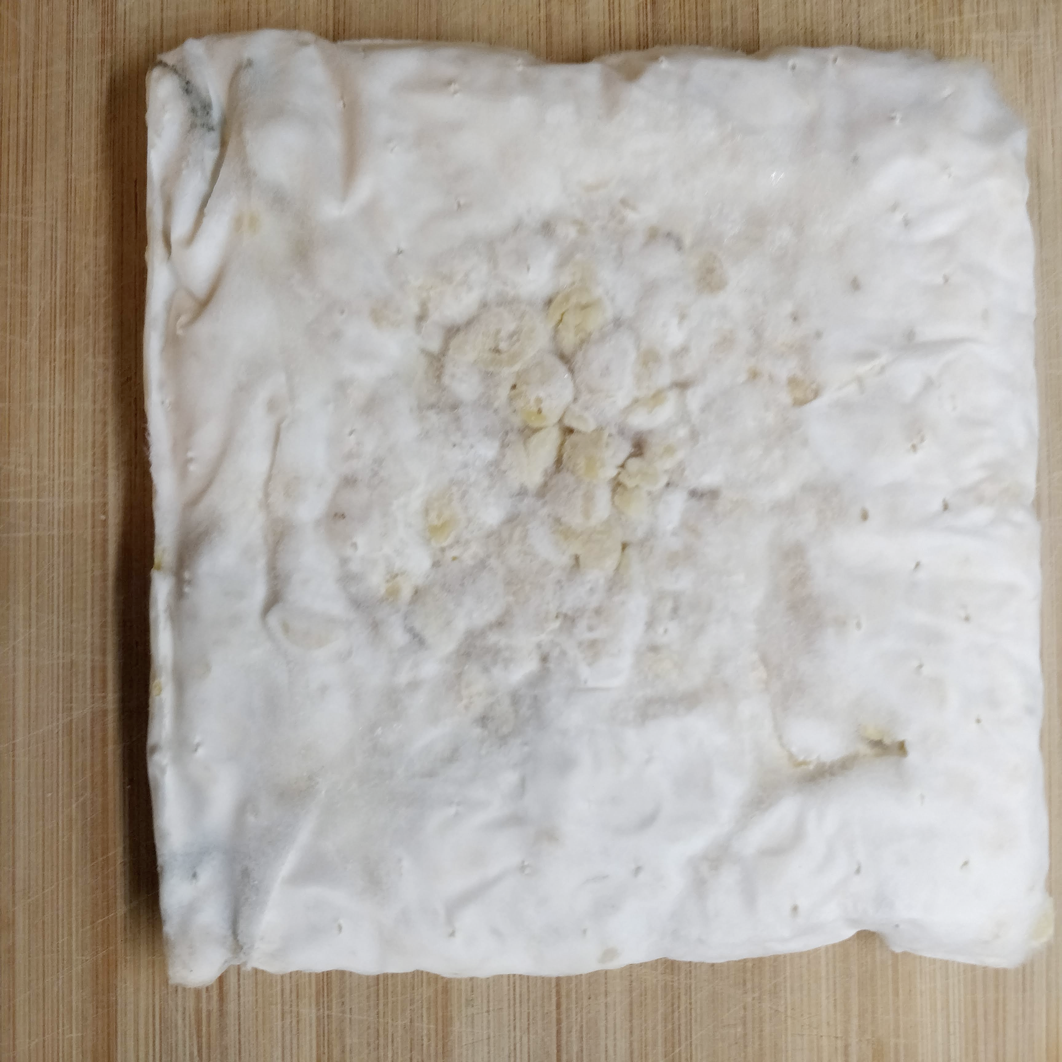 4. Fava beans: Slightly cheesy smell. Plastic: Bit wet and some bigger beans are exposed and touching the plastic and they got sticky-shiny and smell cheesy —> dry the beans better next time and cook less! Cut structure is not bad, but there are wet beans visible that turned brown and funky. Throw away. Open: Irregular surface of beans with some fluffy mycelium growing up, some sporulation. When cut quite crumbly, because beans are quite big. Spores are also inside, probably because of air pockets —> press better together and maybe cover with something. Also chop a bit smaller next time. Smell of open sample not unpleasant, so the smell comes really from the exposed beans-on-wet-plastic in the plastic bag sample.
