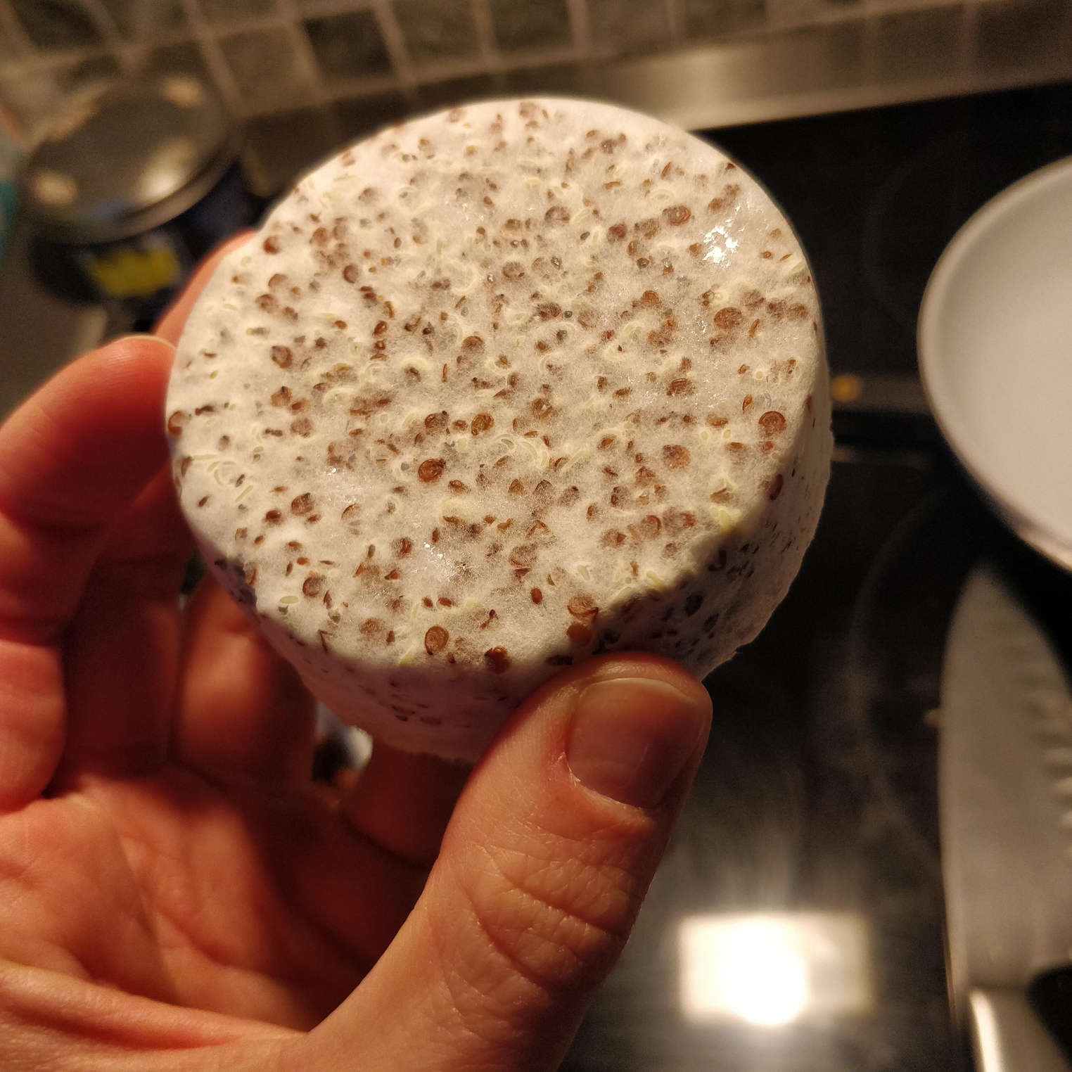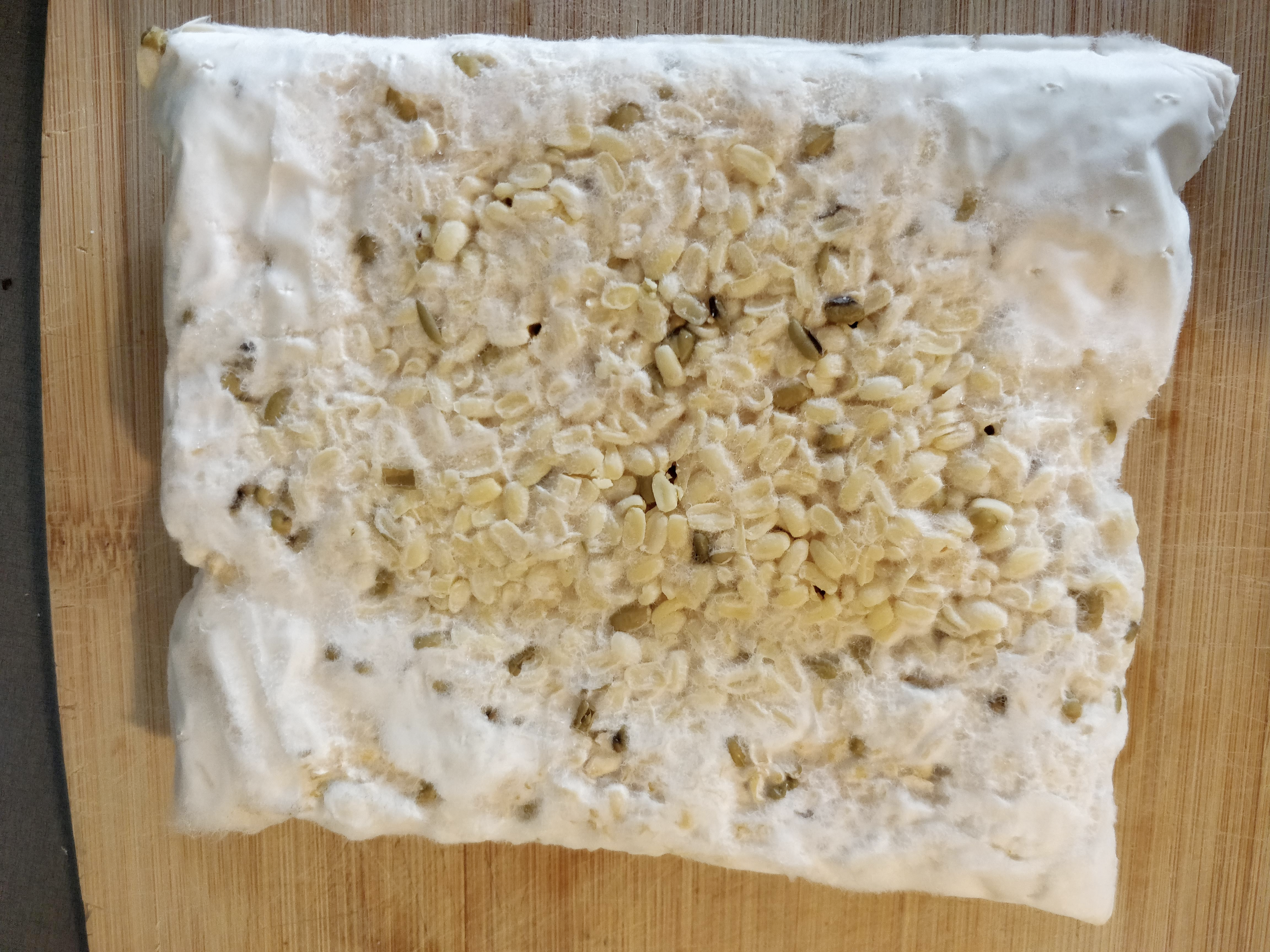 Very loose cake, falls apart when I try to lift it since the mycelium is not strong enough to hold the whole beans together. Would’ve been probably better to chop the beans a bit, and the skin is possibly also too tough for the fungus to penetrate properly. It also looks a bit unpleasant, since the black spots look like spore formation through the white mycelium.