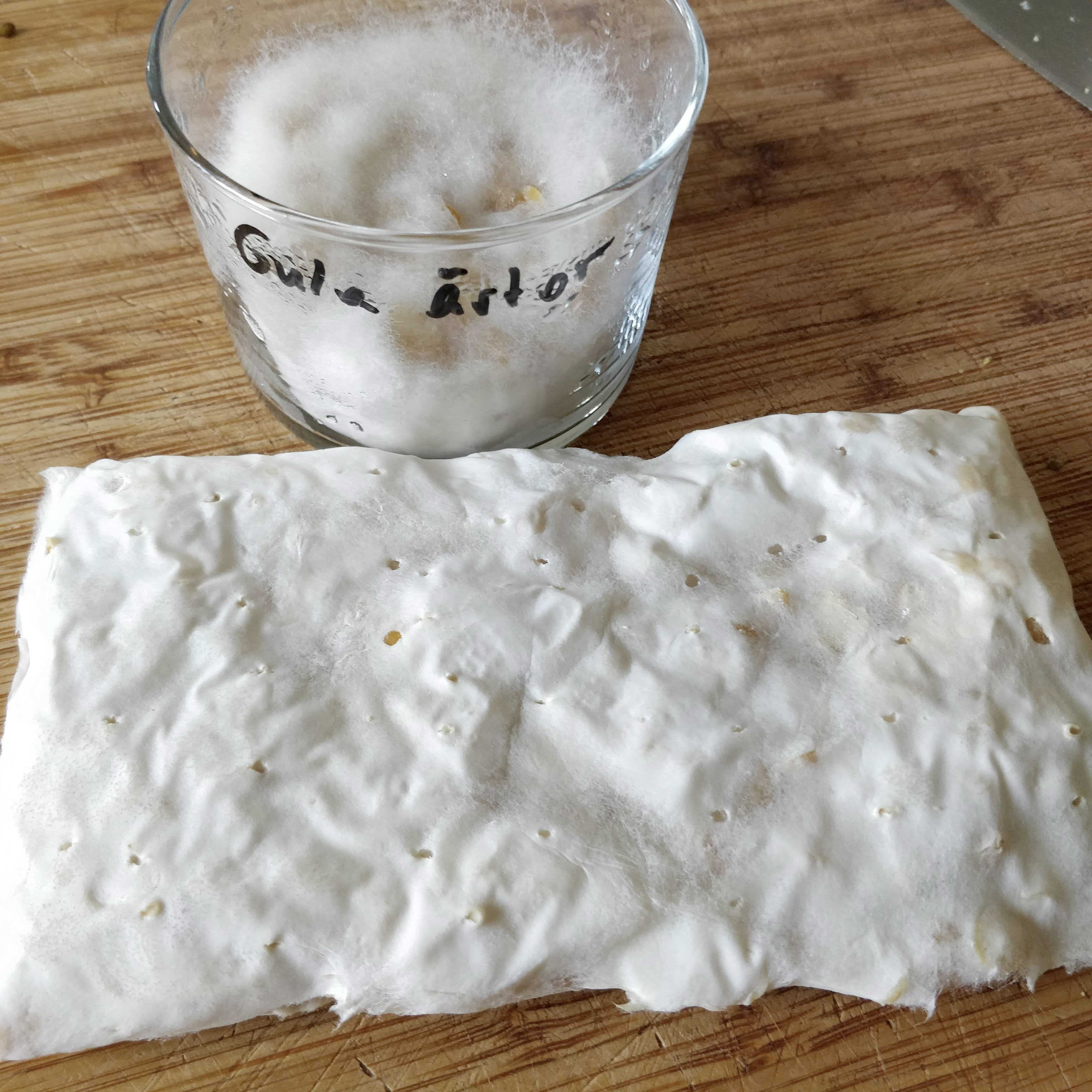 Grey peas: From Ville. Soak o/n, cook for 10 min. Add 1/2 Tbsp (4 Tbsp/kg) apple cider vinegar and let dry in 30°C oven. Squash a few peas with a fork to provide starting material for fungus.