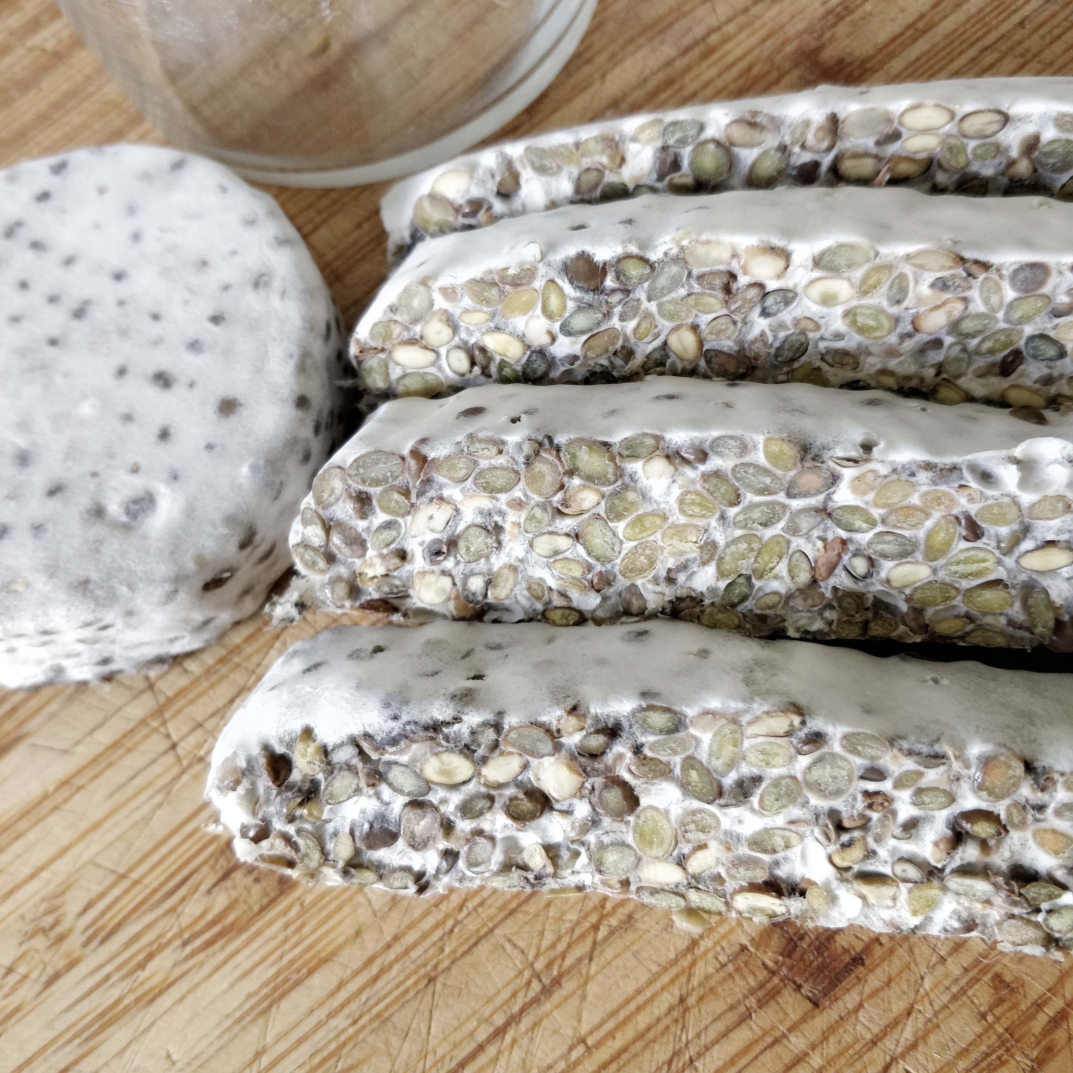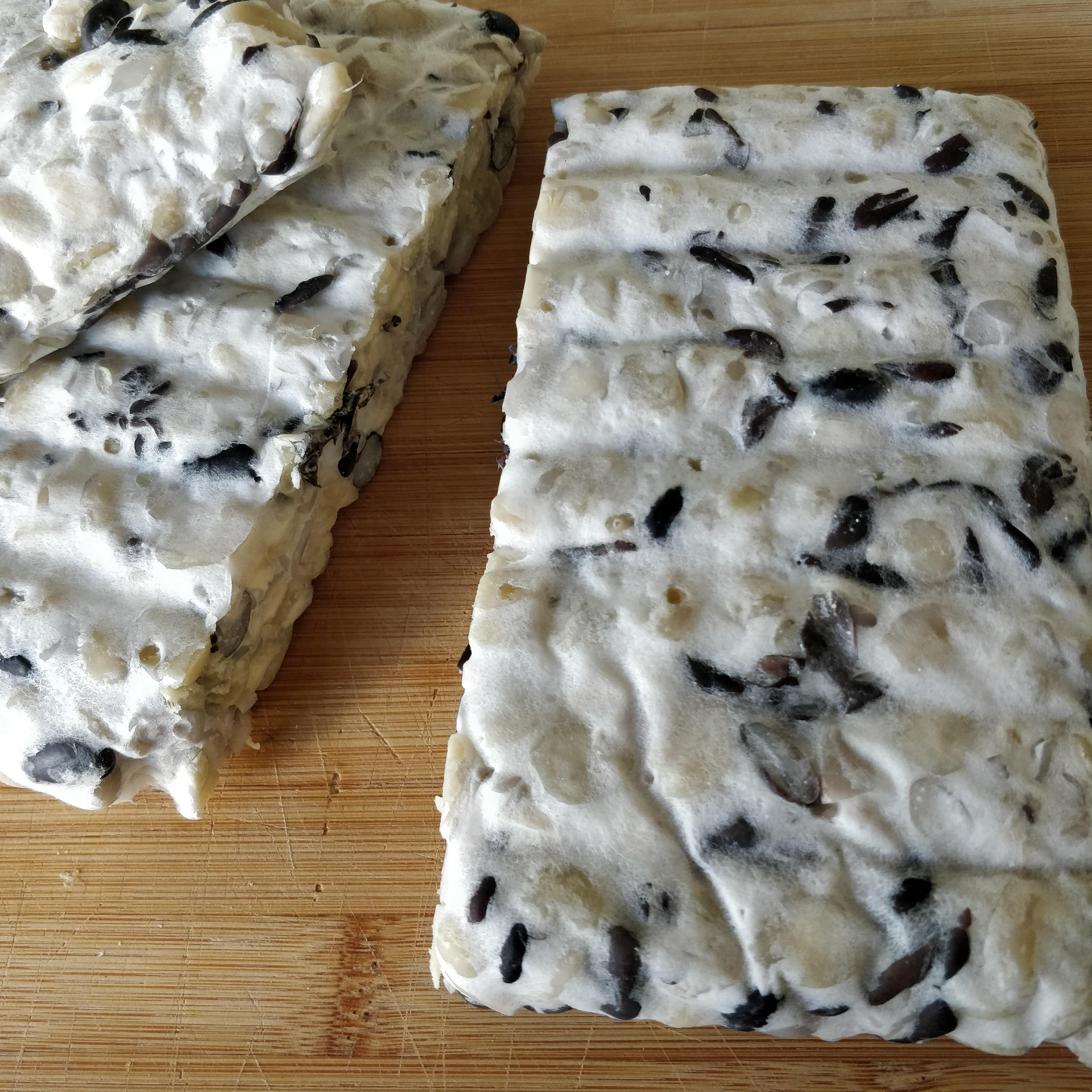 Test: Addition of things that give more texture to Fava bean tempeh: Sunflower seeds, sesame seeds.