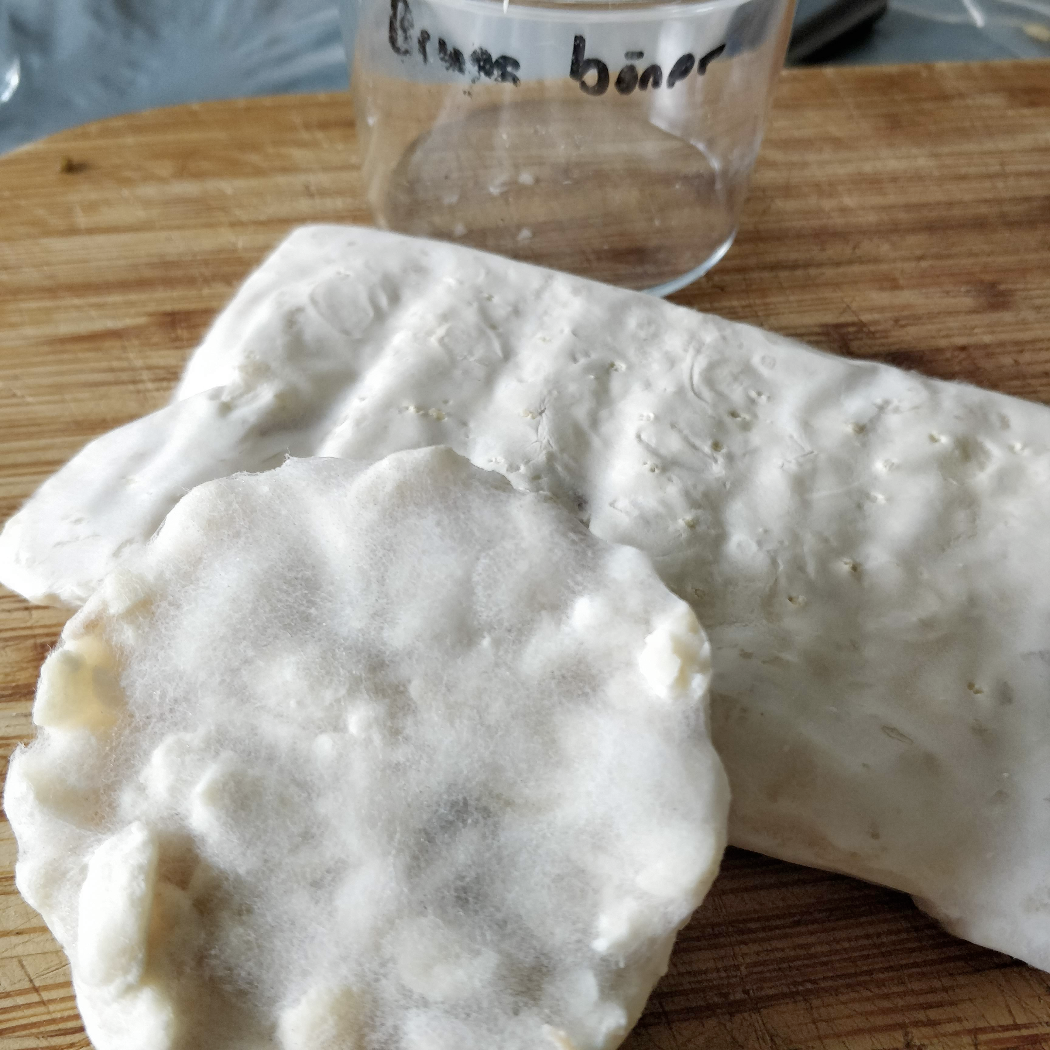 1. Yellow peas: Smell is quite mild, slightly mushroomy. Open: Very nice, dense little block with thick mycelium all around. Not too fluffy on top, little sporulation, mild smell. Plastic: Block is nicely dense, but a bit irregular because the peas are quite big and the bag was lying on a rack. Both: Nice to cut, but slightly fragile due to size of beans —> maybe chop a little bit before mixing with the starter? Looks good, basically like toor dal tempeh. But a few harder peas are visible in the mix. Interesting to see how they will be when cooked/fried.