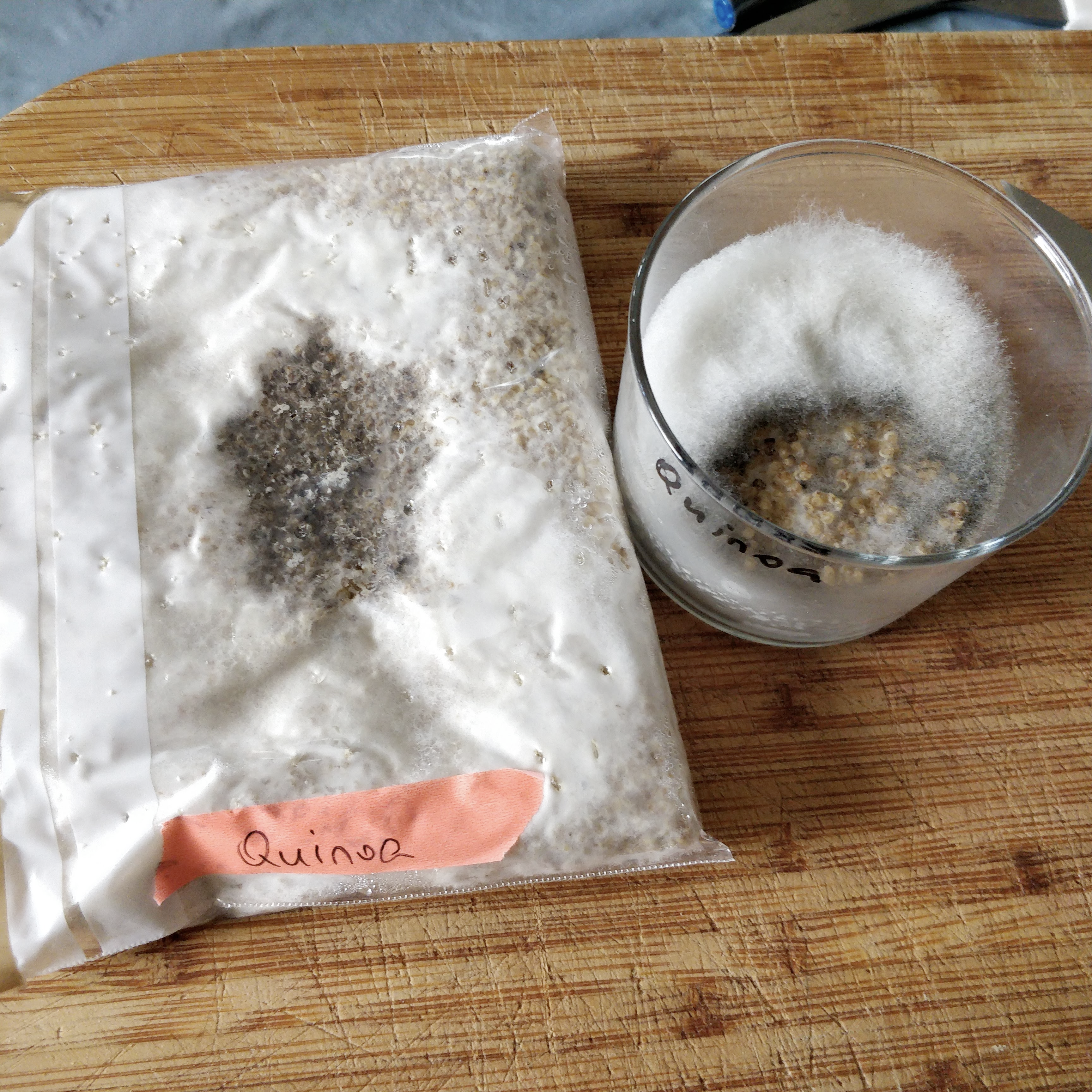 6. White quinoa: Got the hottest and developed mycelium the fastest. The open incubation even started sporulating (not the case for any other substrates). Plastic: Big non-mycelium spot in the middle with unpleasant smell and colour. It’s sticky and slimy —> remove! —> Dry the grains more and mix with something bigger to avoid too dense cake. The nice parts have a slighly animal and rotten smell, not entirely pleasant. Nice dense cake in most parts, but e.g. the corners of the plastic bag are not as dense and a bit wet and smell more sharp (ethanol, ammonia). Open: Nice, dense cake, but a lot of fluffy, sporulating mycelium on top —> incubate for a shorter time! Smell of open is less unpleasant and more mushroomy than the plastic bag —> Maybe quinoa needs a LOT of air.