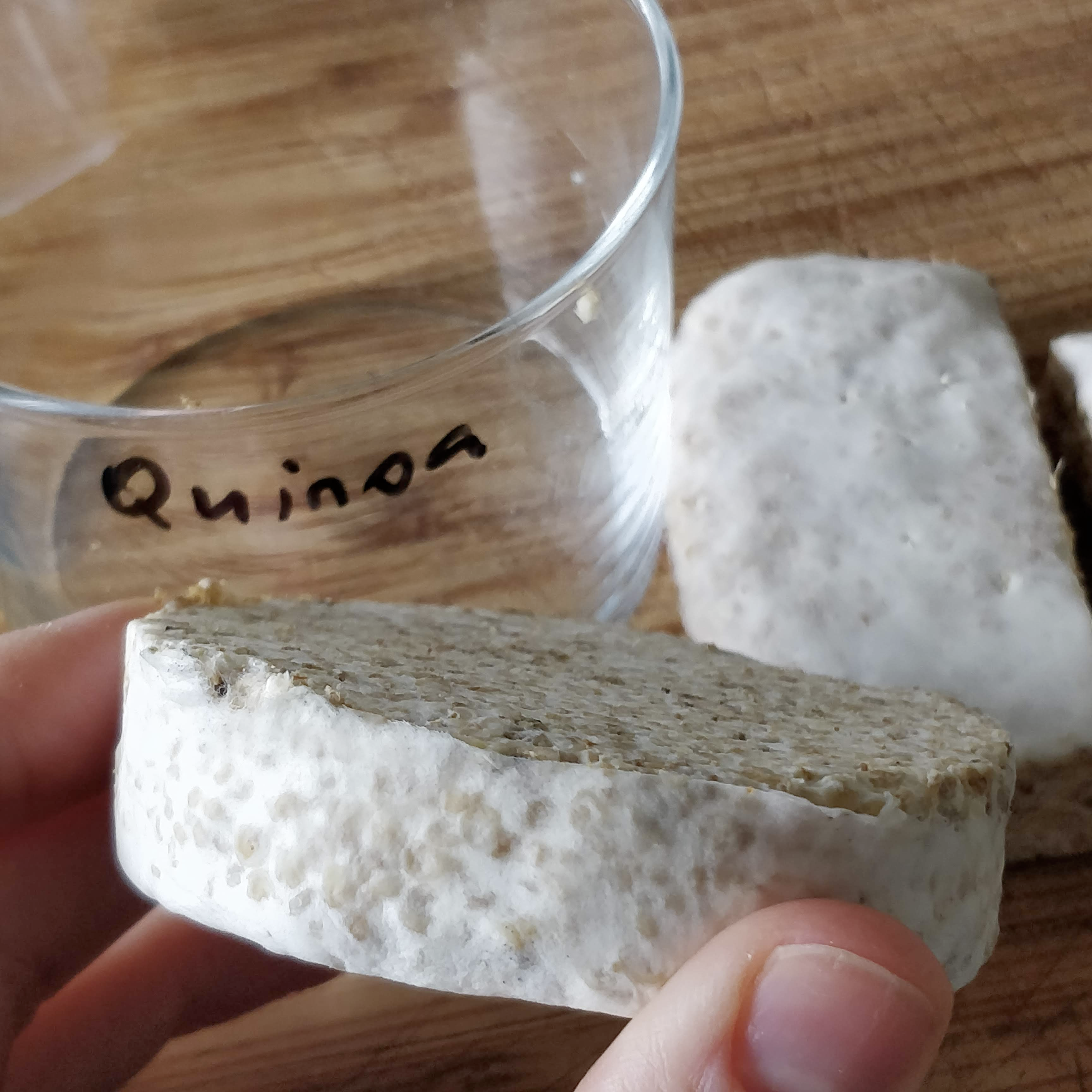 2. Gotland lentils: Open: Very fluffy on the top and a tiny bit sporulation. Black colour is visible underneath, but that’s from the lentils, not spores. Plastic: Quite dense block, no wet or empty bits. Nice to cut and looks very pretty, but the lentils start falling out of the block a bit. When boiled, quite many lentils fall out, leaving small holes in the block. Not holding together as well as e.g. brown beans. Quite brittle after boiling —> mix lentils with something else! Both: Slightly unpleasant dank smell, similar to the quinoa samples.