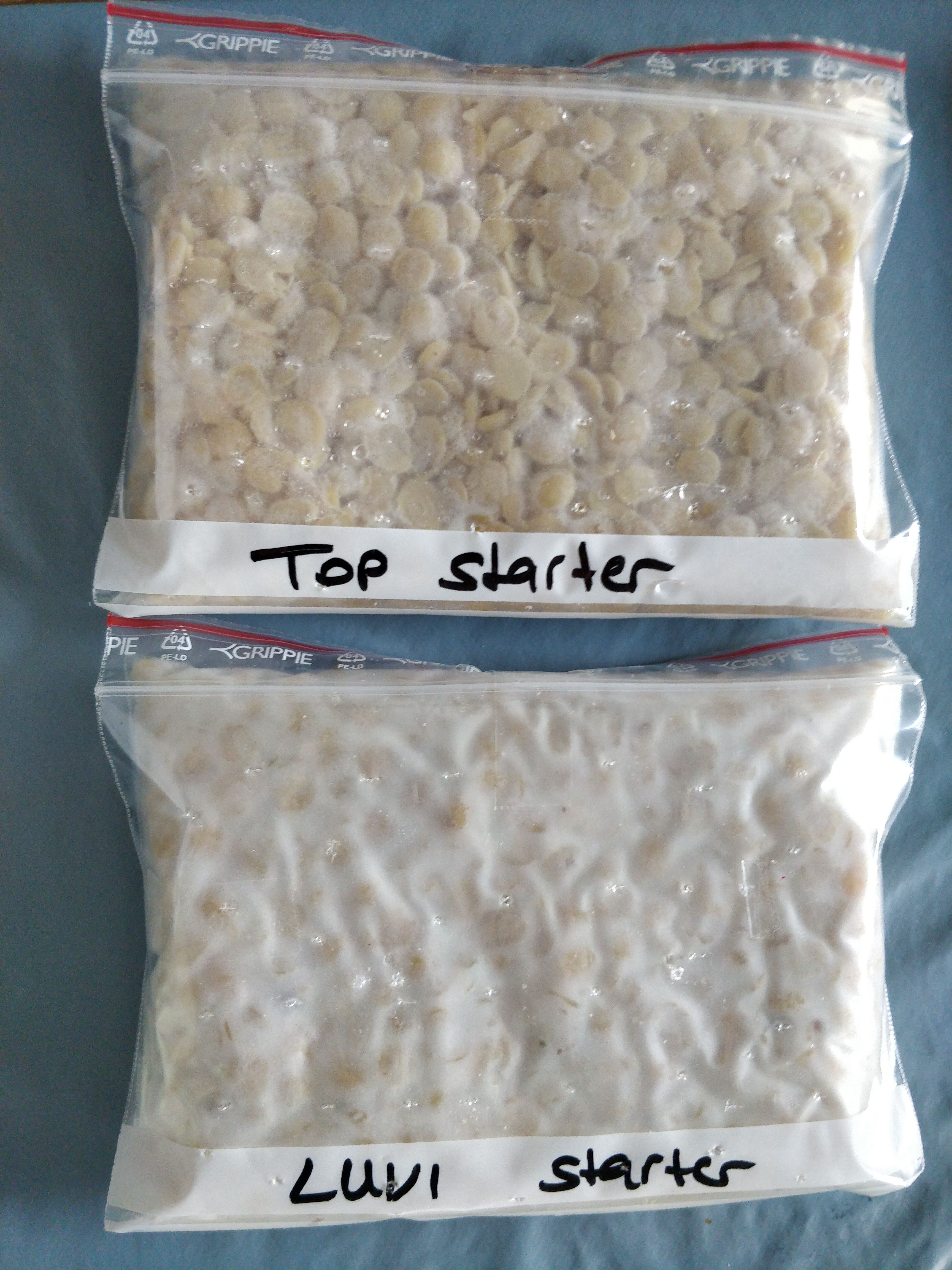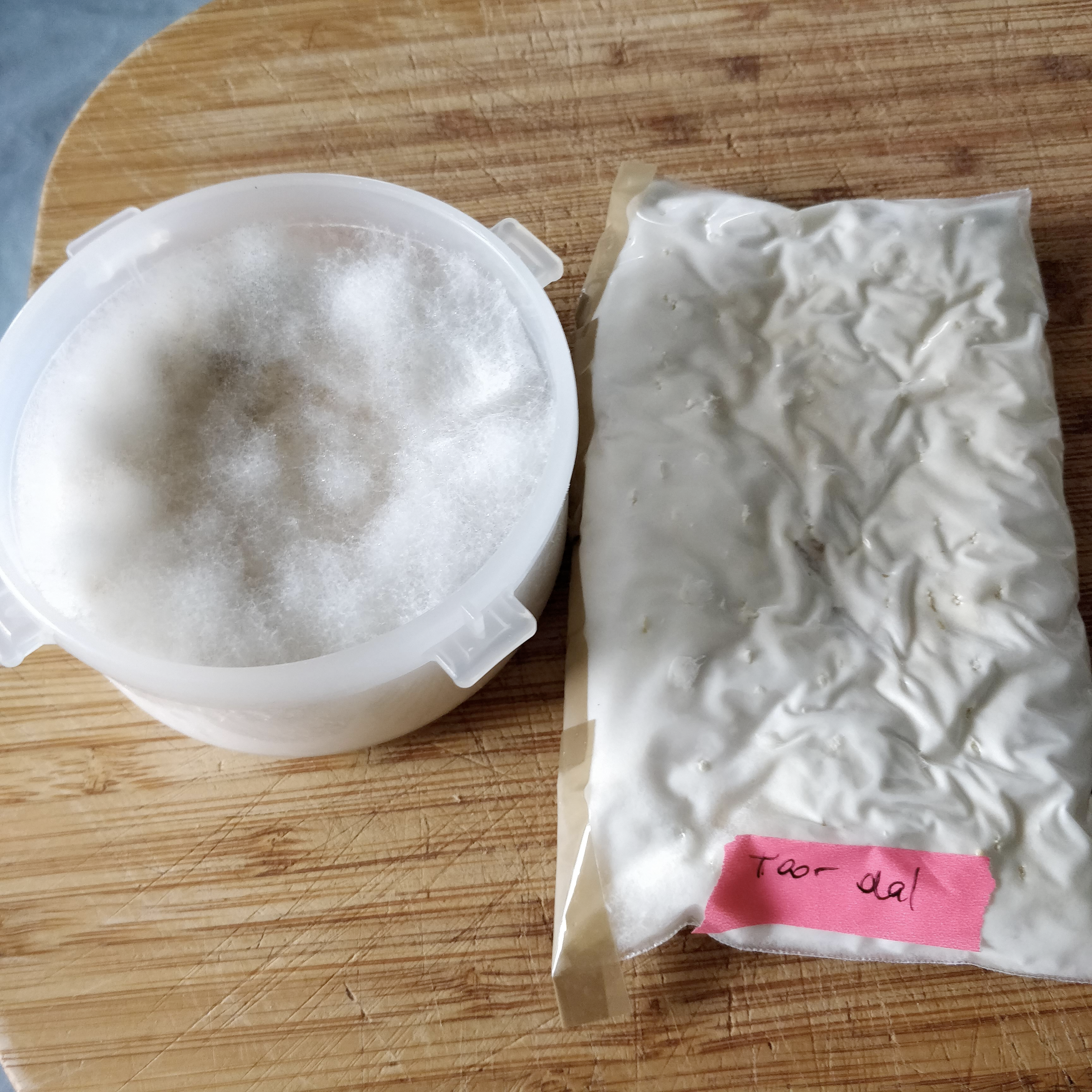 250g Toor dal, soak o/n, then boil for 7 min. Drain, add 1 Tbsp apple cider vinegar (4 Tbsp/kg), let dry in oven at 30°C. Add 1/2 tsp LUVI starter (2 tsp/kg), mix. 1 bag: only Toor dal, 1 bag: a bit of ripped apart sockertång dispersed in the dal. Incubate in oven at 30°C.
