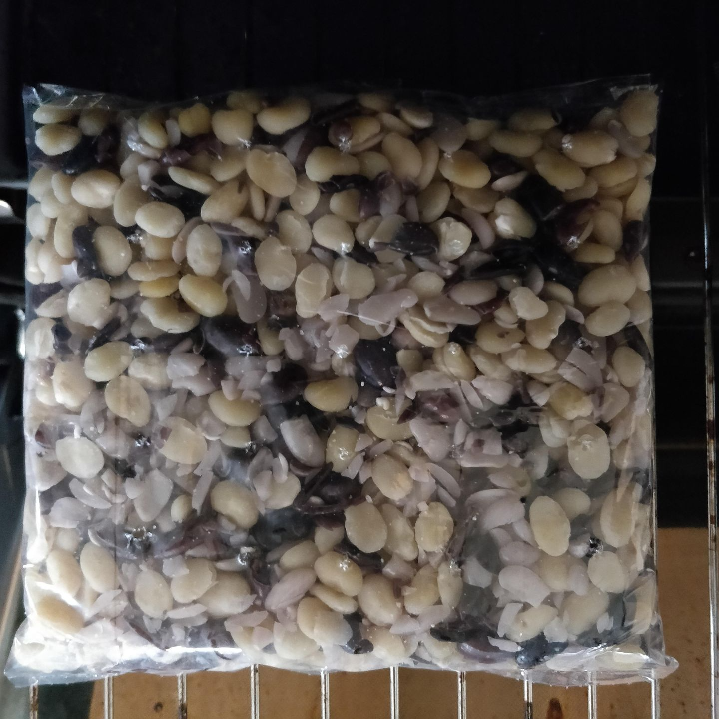 Mix toor dal with half of black beans (cooked weight: 225g). Mix favabeans with half of black beans (cooked weight: 225g). Then fill in bags (new bags ordered from Fyndiq: Zip bag 16x12cm, PE-LD): 300g are a good amount to completely fill the bag and get a nice thick cake. Total: 4x300g and a small bag with the rest of all beans mixed (150g) (i.e. 750g dry beans made 1350g wet beans/tempeh).