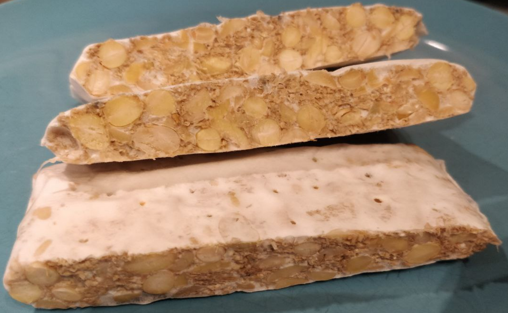 Overall, 24h sample falls apart too much and doesn’t really taste of tempeh, just of lentils and beans. 36h and 48h are very close with 48h being slightly better. 36h tastes of several things, whereas 48h has a more rounded flavour profile. Both have kept a “healthy” tasting texture, i.e. more beans and lentils than meaty. Interesting since I’m sure earlier tempeh trials that resulted in very chewy-juicy tempeh were also incubated for 36-48h. Must be either the starter, the beans (e.g. soybeans) or the “suboptimal” incubation conditions in the fridge cupboard that cause the different texture. Both the 36h and 48h ones would be suitable for restaurants, whereas e.g. for a burger you’d want something chewier and juicier.