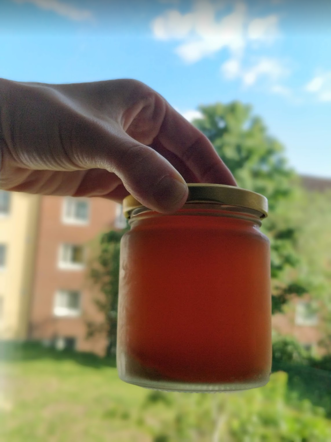 Pleasant smell and taste, no mould, only little white settlement (yeast?) on the bottom. Drain and sieve the contents with coffee filters, heat up to boiling point in a pot, then leave for 5 min. Boil a glass jar and fill the hot liquid into it. Store in fridge = 3 month sample.